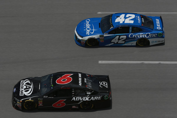 Trevor Bayne, the driver of the #6 AdvoCare Ford, leads Kyle Larson, driver of the #42 Credit One Bank Chevrolet, during practice for the Monster Energy NASCAR Cup Series GEICO 500 at Talladega Superspeedway on April 27, 2018, in Talladega, Alabama. Photo – Sean Gardner/Getty Images