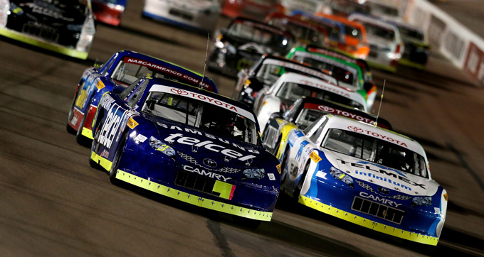 Daniel Suárez, front left, battles for the lead en route to his fourth consecutive win, with a victory in the Toyota 120 at Phoenix