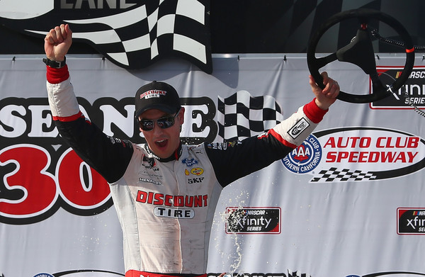 Joey Logano, the driver of the #22 Discount Tire Ford, celebrates in victory lane after winning the NASCAR Xfinity Series Roseanne 300 at Auto Club Speedway on March 17, 2018, in Fontana, California. Photo – Sarah Crabill/Getty Images