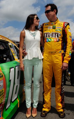 Kyle Busch, driver of the #18 M&M’s Toyota, and his wife Samantha take part in pre-race ceremonies for the NASCAR Sprint Cup Series Quicken Loans 400 at Michigan International Speedway on June 16, 2013