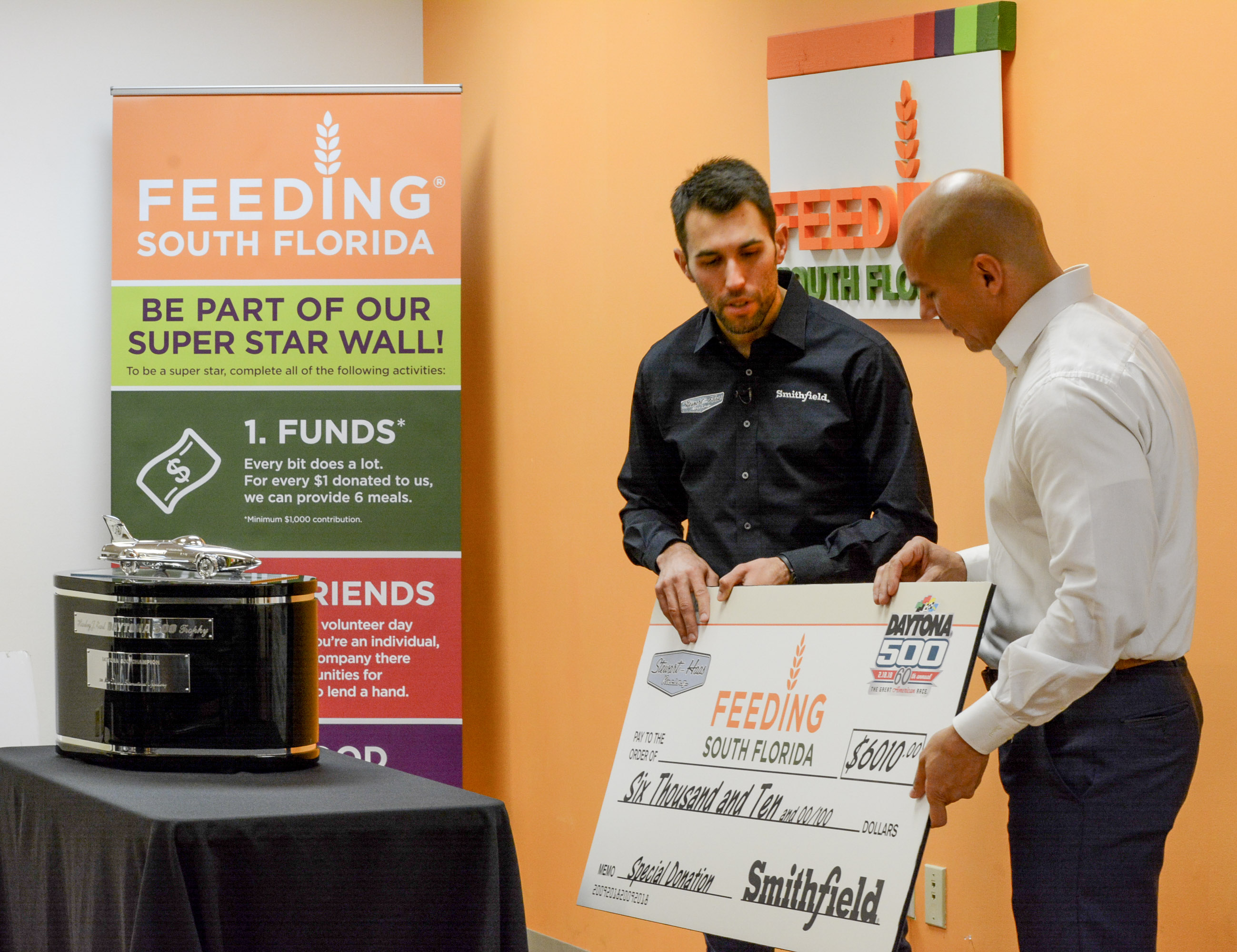 With the Harley J. Earl DAYTONA 500 trophy in the background, driver Aric Almirola presents a check from his sponsor Smithfield Foods for $6,010 – with the 60 representing the 60th running of the DAYTONA 500 and the 10 representing his new car number – to Paco Velez, President, and CEO of Feeding South Florida. Photo – Courtesy of DIS