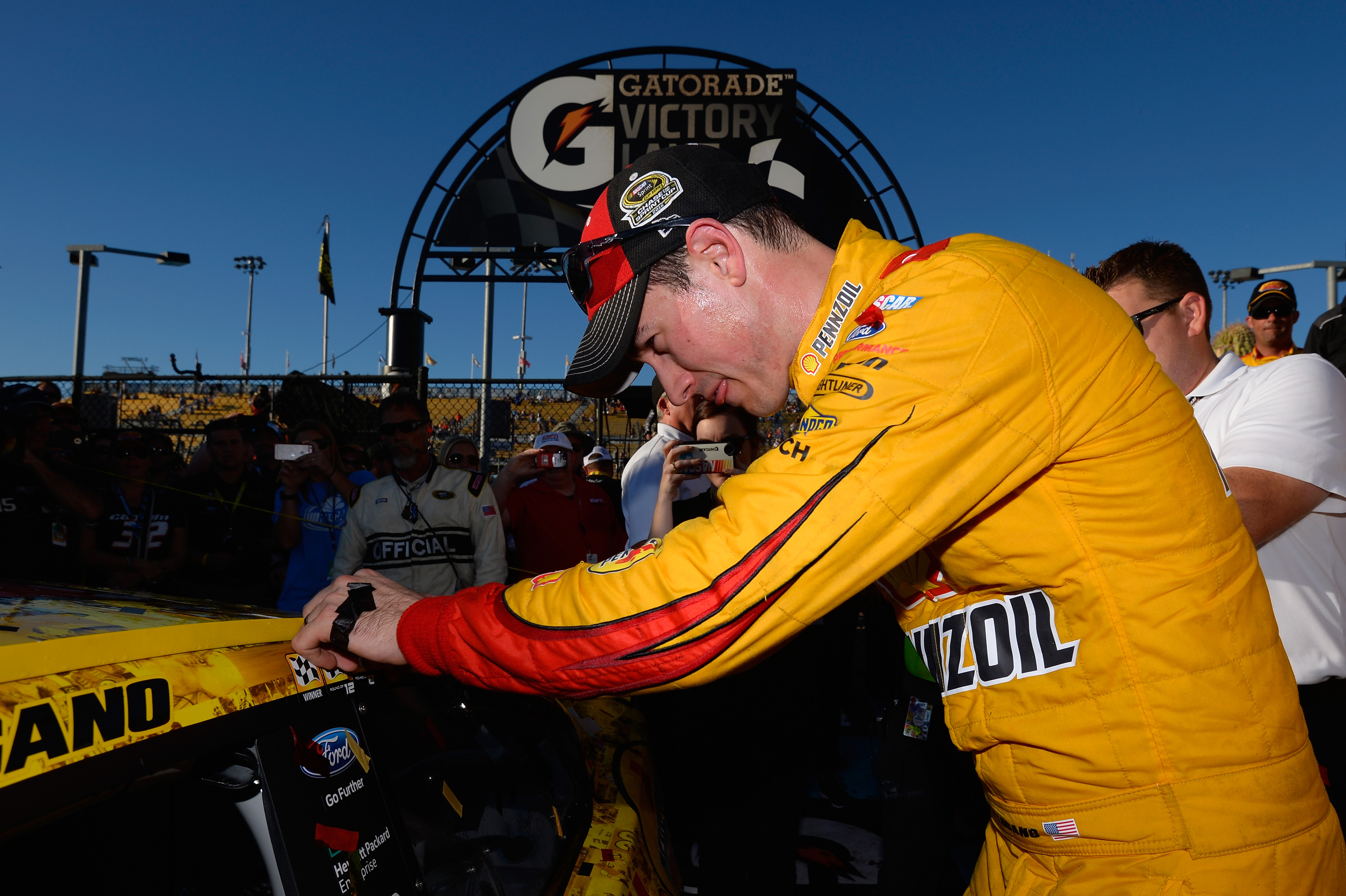 Joey Logano, driver of the #22 Shell Pennzoil Ford, places the winner’s decal on his car in Victory Lane after winning the NASCAR Sprint Cup Series Can-Am 500 at Phoenix International Raceway on November 13, 2016 in Avondale, Arizona. Photo by Robert Laberge/Getty Images