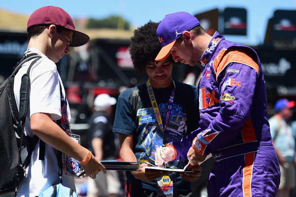 Denny Hamlin, the driver of the #11 FedEx Express Toyota, signs autographs for fans during practice for the Monster Energy NASCAR Cup Series Toyota/Save Mart 350 at Sonoma Raceway on June 22, 2018, in Sonoma, California. Photo – Jared C Tilton/Getty Images