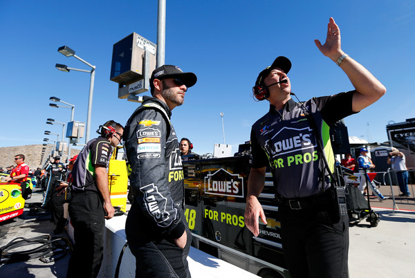 Jimmie Johnson, the driver of the #48 Lowe’s for Pros Chevrolet, talks to crew chief Chad Knaus on the grid during qualifying for the Monster Energy NASCAR Cup Series TicketGuardian 500 at ISM Raceway on March 9, 2018, in Avondale, Arizona. Photo – Jonathan Ferrey/Getty Images