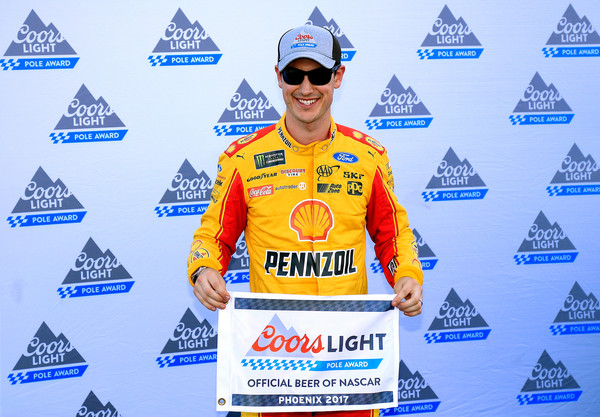 Joey Logano, driver of the #22 Shell Pennzoil Ford, poses with the Coors Light Pole Award after qualifying in the pole position for the Monster Energy NASCAR Cup Series Camping World 500 at Phoenix International Raceway on March 17, 2017 in Avondale, Arizona. Photo – Chris Trotman/Getty Images