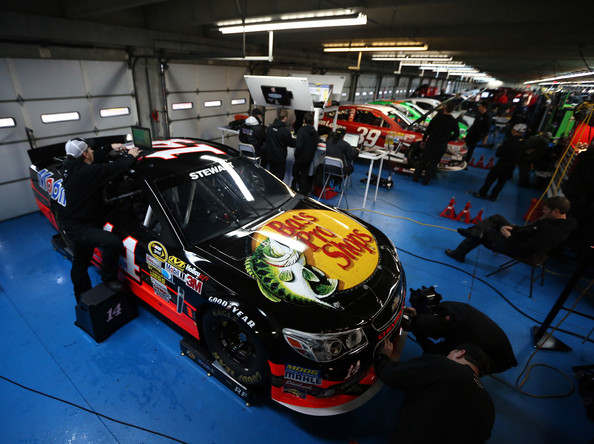 The car of Tony Stewart, driver of the #14 Bass Pro Shops Chevrolet, sits in the garage during NASCAR Testing at Charlotte Motor Speedway at Charlotte Motor Speedway on January 17, 2013 in Charlotte, North Carolina. January 16, 2013