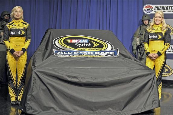 Miss Sprint Cup Brooke Werner, left, and Jaclyn Roney wait to unveil the Bruton’s Big Bonus race car during a press event on Feb. 26, 2013, announcing changes to the format for the 2013 NASCAR Sprint All-Star Race.