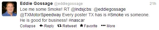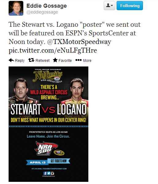 By clicking the link above, note this tweet from Eddie Gossage was retweeted 60 times at the time of this publication. In stark contrast to his comments referring to Kurt Busch’s threat, here’s what Gossage had to say about Tony Stewart: