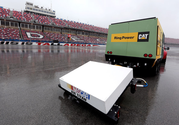 However the innovative first phase of the NASCAR-developed Air Titan™ track-drying system was on site at Talladega and was dispatched for both events. That deployment was the official beginning of a stretch goal charged by NASCAR Chairman Brian France less than a year ago: Significantly reduce the time it takes to dry the track to benefit the fans in the stands and those watching on television.