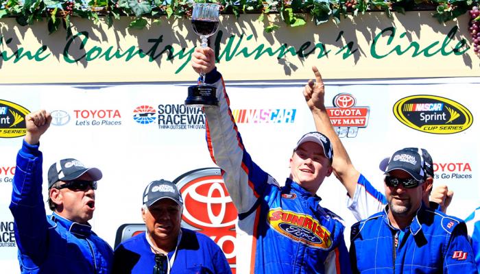 Derek Thorn celebrates in Victory Lane at Sonoma after winning the NASCAR K&N Pro Series West Carneros 200.