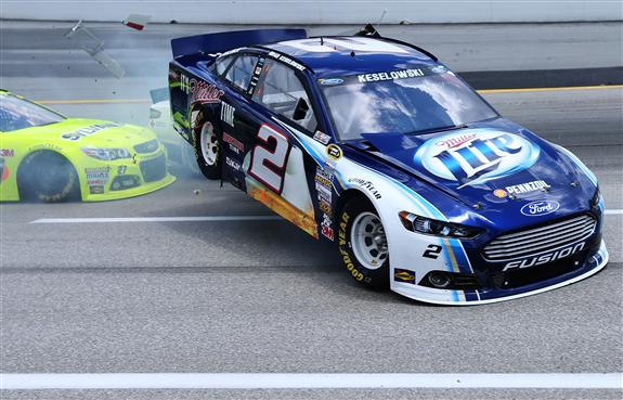 Brad Keselowski, driver of the #2 Miller Lite Ford, is involved in an incident during the NASCAR Sprint Cup Series Quaker State 400 at Kentucky Speedway on June 30, 2013