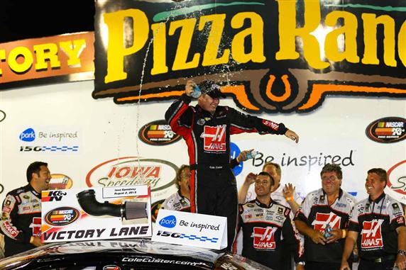 Cole Custer celebrates in NASCAR K&N Pro Series Victory Lane after winning the Pork Be Inspired 150 at Iowa Speedway.