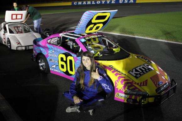 Lyn-Z Pastrana, wife of NASCAR Nationwide Series driver and action sports star Travis Pastrana, ran the fastest lap in qualifying Monday night in preparation for Thursday’s Better Half Dash charity Bandolero race at Charlotte Motor Speedway. Photo – CMS/Jonathan Coleman