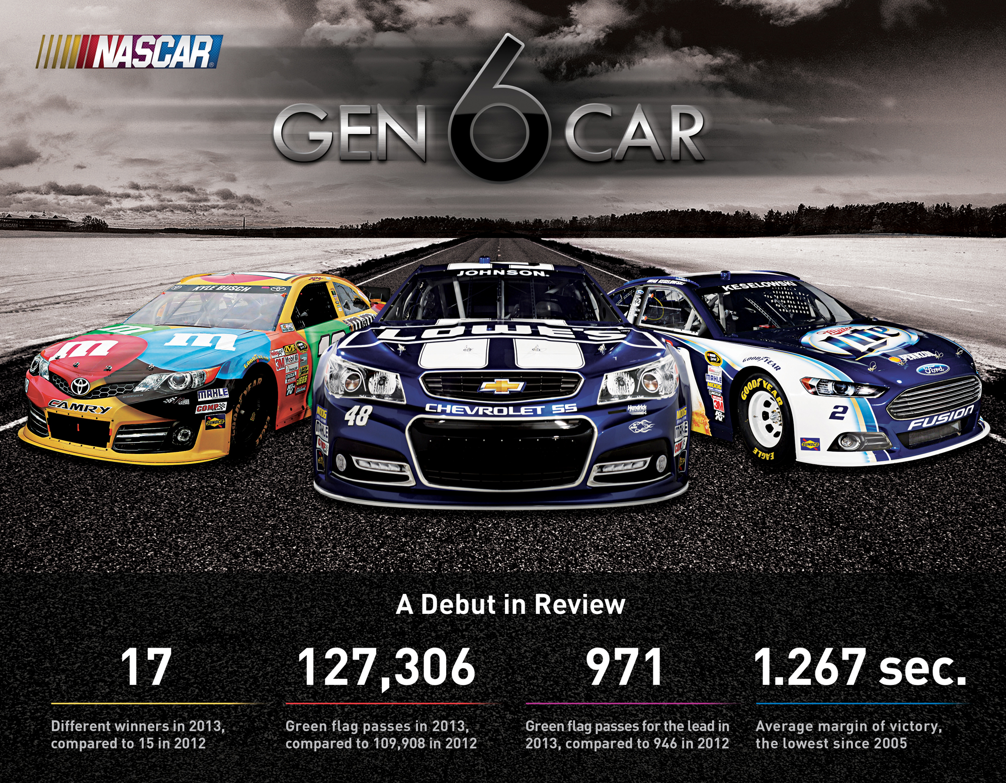 When the 2013 season began, everyone was anticipating the newest generation of stock cars on the track in NASCAR‘s Sprint Cup Series. With the season complete, it’s now time to take at look at the Gen-6 car’s début season by the numbers.