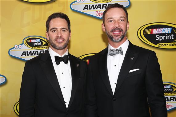 NASCAR Sprint Cup Series Champion Jimmie Johnson and crew chief Chad Knaus pose backstage during the 2013 NASCAR Sprint Cup Series Champion’s Awards Ceremony at Wynn Las Vegas on December 6, 2013