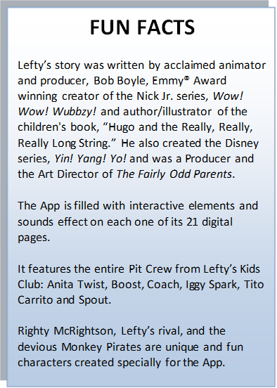 With the app, produced by Bento Box Interactive and designed by Emmy®-winning artist Bob Boyle (The Fairly Odd Parents and Wow! Wow! Wubbzy!), readers will get a front row seat to the action as Lefty Turner and his pit crew get ready for race day, which comes alive with animation, music and sound effects. Who will win the race and survive treacherous obstacles including the dreaded Motorcar Monkey Pirates? Will it be the studious Lefty or his hasty rival Righty McRightson?