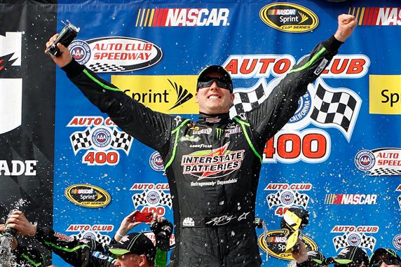 The first driver on four fresh tires for a restart on Lap 205 at Auto Club Speedway, Busch passed Stewart-Haas Racing teammates Kurt Busch and Tony Stewart on the next-to-last lap, bringing rookie Kyle Larson with him.