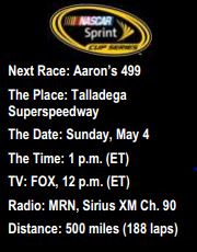 Television coverage of the Aaron’s 499 on May 4th is on FOX at 12 pm ET with a Green Flag at 1 pm ET. Radio coverage is on MRN and Sirius XM, channel 90.