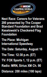 - Johnny Sauter: The model of consistency in the series seems poised to break out with a victory. The No. 2-ranked driver in the points standings carries momentum from Pocono where he finished second and led 64 laps. He has five top-five and nine top-ten finishes in 11 starts this season.