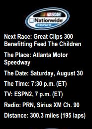 Ty Dillon’s point deficit could be considered large, but conquerable, especially starting this weekend at Atlanta. Dillon won his Camping World Truck Series début at Atlanta in 2012. Though this will be his Nationwide début at Atlanta this weekend, he has finished in the top-ten in four of the previous 1.5-mile tracks the series has competed on this season. Dillon has posted one win, four top-fives and 16 top-tens this season. Dillon will also be making his series début in the Sprint Cup Series this weekend at Atlanta becoming the tenth driver this season to compete in all three of NASCAR’s national series.