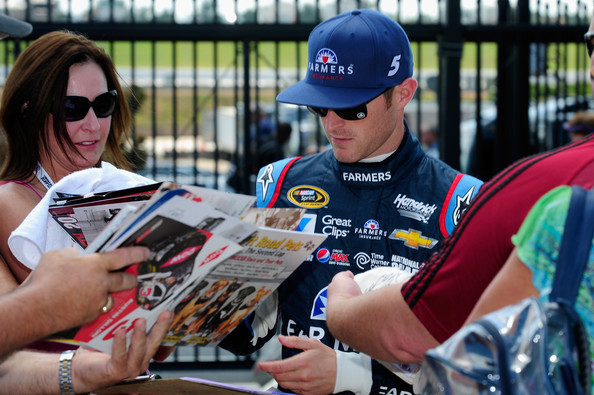 Kasey Kahne, driver of the #5 Farmers Insurance Chevrolet, signs autographs for fans during practice for the NASCAR Sprint Cup Series Oral-B USA 500 at Atlanta Motor Speedway on August 29, 2014 Photo – Jeff Curry/Getty Images