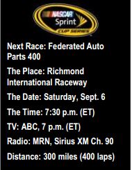 Saturday’s Federated Auto Parts 400 at Richmond International Raceway (7:30 p.m. ET on ABC) could not come at a better time for Bowyer. Barring a minor miracle, he needs to win to get into the Chase and Richmond is a place where he’s a proven victor. Arguably his best track, Bowyer boasts two wins, three top fives and nine top 10s at the .75-mile, D-shaped course