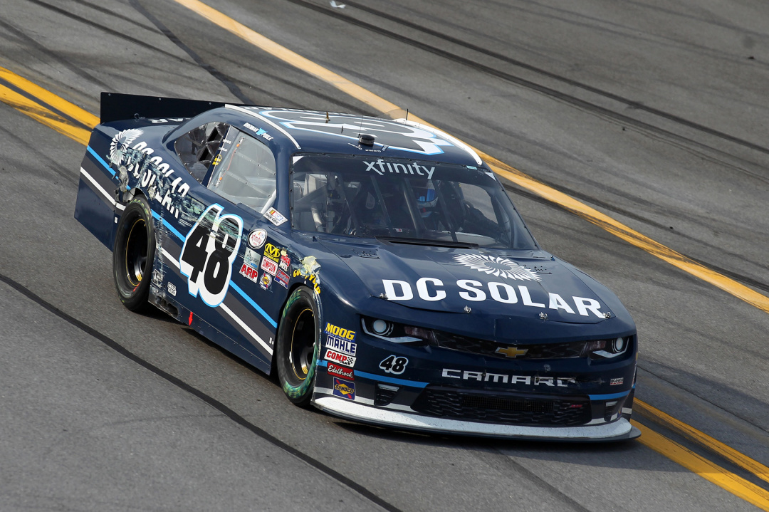 Brennan Poole, driver of the #48 DC Solar Chevrolet crosses the finish line under caution after the NASCAR XFINITY Series Sparks Energy 300 at Talladega Superspeedway on April 30, 2016