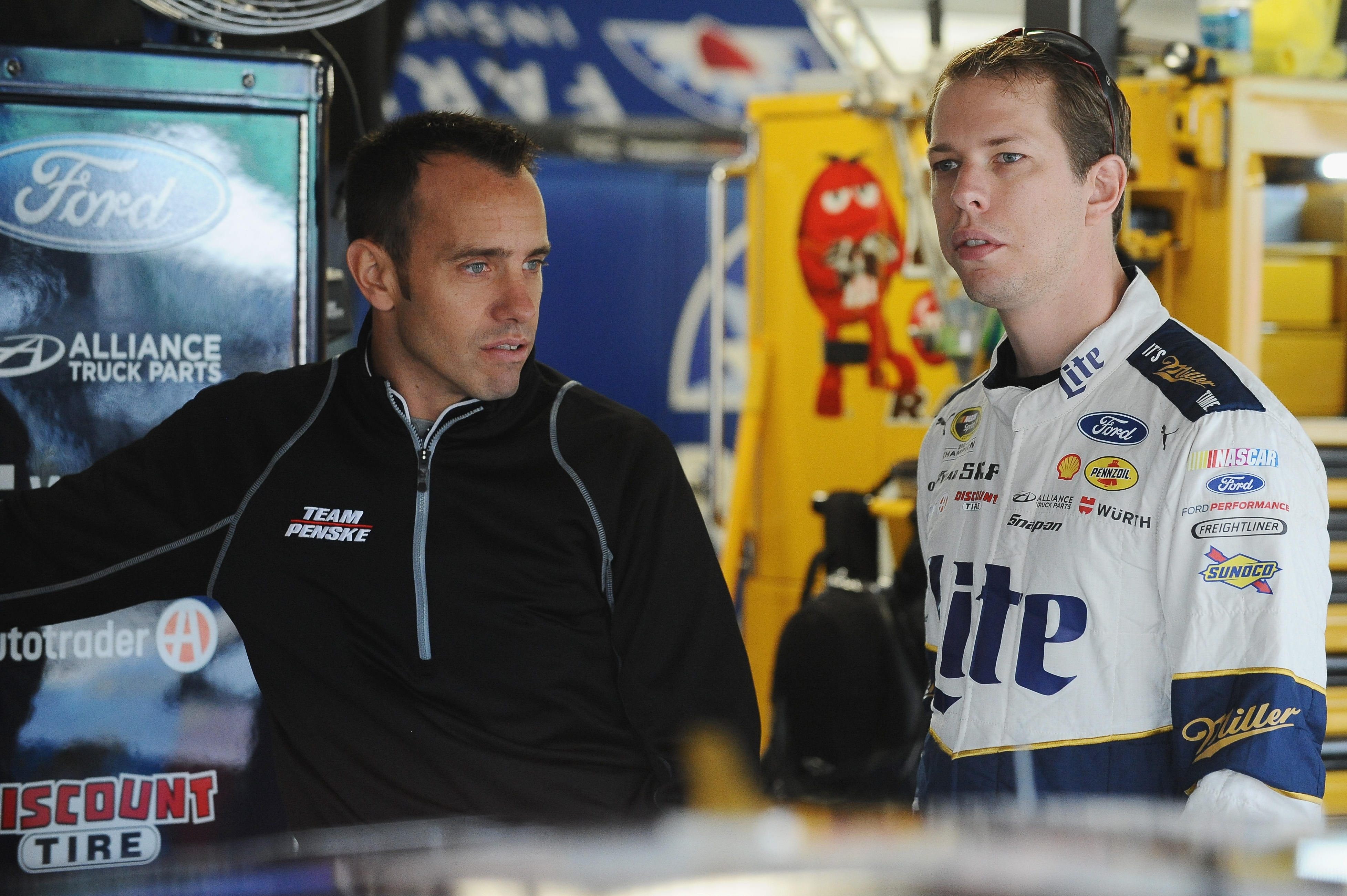 Brad Keselowski, driver of the #2 Miller Lite Ford, and crew chief Paul Wolfe talk in the garage during practice for the NASCAR Sprint Cup Series Hollywood Casino 400 at Kansas Speedway on October 15, 2016 in Kansas City, Kansas Photo – Ranier Ehrhardt/Getty Images