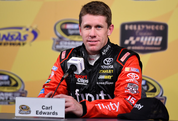 Carl Edwards, driver of the #19 Xfinity Toyota, holds a press conference after practice for the NASCAR Sprint Cup Series Hollywood Casino 400 at Kansas Speedway on October 14, 2016 in Kansas City, Kansas Photo – Josh Hedges/Getty Images
