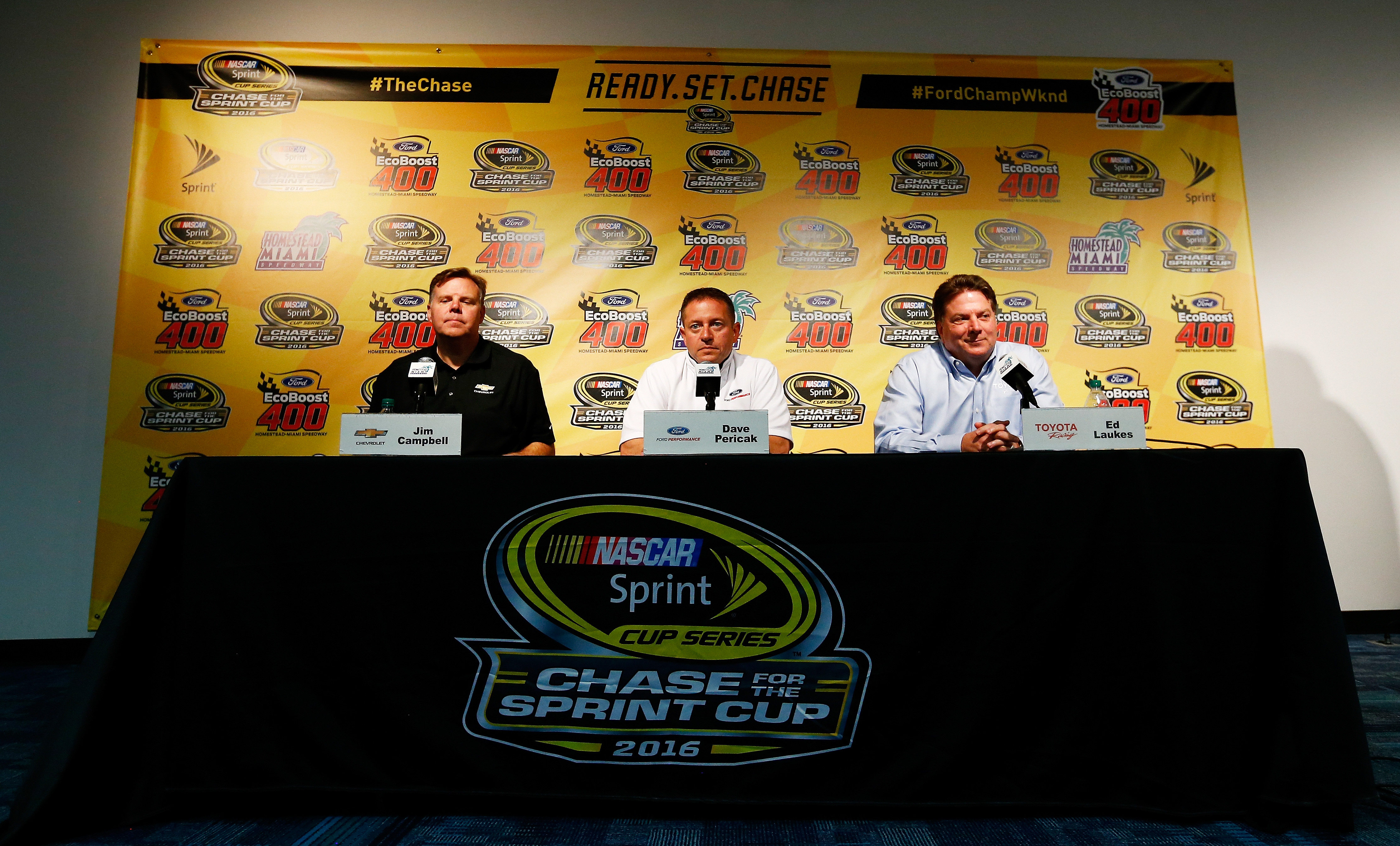 HOMESTEAD, FL – NOVEMBER 19: (L-R) U.S. Vice President, Performance Vehicles and Motorsports, Jim Campbell, Director of Ford Performance Dave Pericak and Toyota Vice President of Marketing and Media, Incentives & Motorsports Edward Laukes speak with the media at a press conference during practice for the NASCAR Sprint Cup Series Ford EcoBoost 400 at Homestead-Miami Speedway on November 19, 2016 in Homestead, Florida. Photo by Jonathan Ferrey/Getty Images
