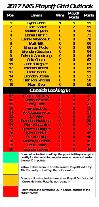 Elliott Sadler looks to extend his four-point standings lead over second-place Ryan Reed. Following them in the point standings are William Byron (9 points behind Sadler), Daniel Hemric (-27) and Darrell Wallace Jr. (-29).