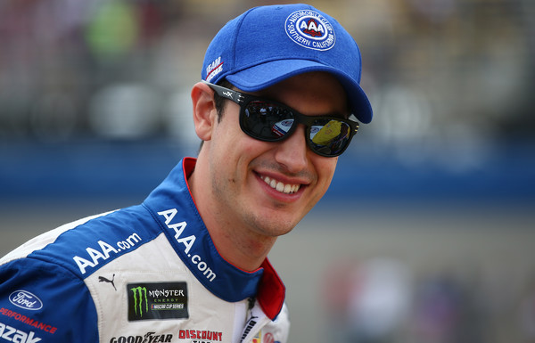 Joey Logano, driver of the #22 AAA Southern California Ford, stands on the grid before the start of the Monster Energy NASCAR Cup Series Auto Club 400 at Auto Club Speedway on March 26, 2017 in Fontana, California. Photo – Sarah Crabill/Getty Images