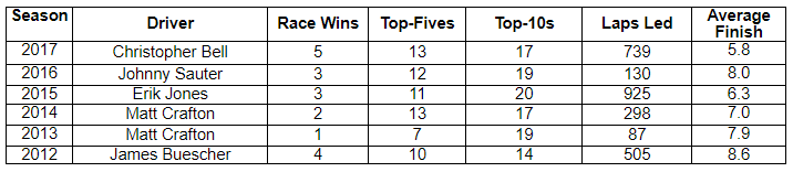 Here is how Christopher Bell’s 2017 season compares to the last five Camping World Truck Series champions: