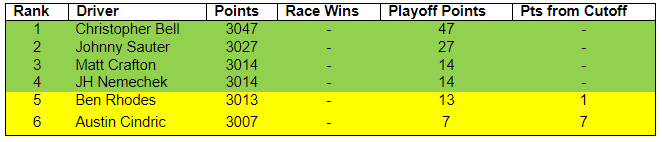 What To Watch For: The Camping World Truck Series starts its Round of 6 at Martinsville Speedway. Christopher Bell leads the Playoff Grid (34 points above Ben Rhodes on the cutoff line). He is trailed by Johnny Sauter (+14), Matt Crafton (+1), John Hunter Nemechek (+1), Ben Rhodes (-1) and Austin Cindric (-7).