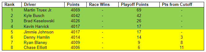 What to Watch for: Martin Truex Jr. heads the Playoff Grid (52 points ahead of Jimmie Johnson on the cutoff line). He is followed by Kyle Busch (+25), Brad Keselowski (+9), Kevin Harvick (even), Jimmie Johnson (even), Denny Hamlin (-3), Ryan Blaney (-8) and Chase Elliott (-11).
