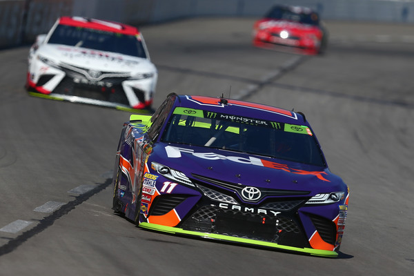 Denny Hamlin, the driver of the #11 FedEx Office Toyota, leads a pack of cars during the Monster Energy NASCAR Cup Series AAA Texas 500 at Texas Motor Speedway on November 5, 2017, in Fort Worth, Texas. Photo – Sarah Crabill/Getty Images