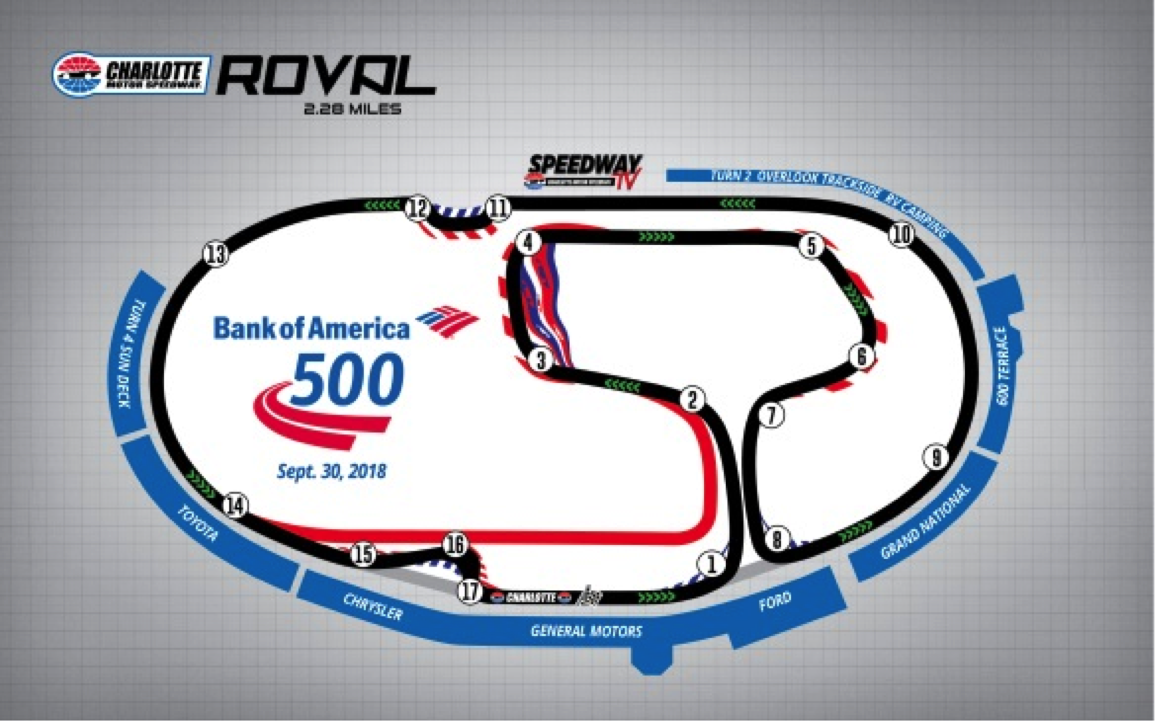 CONCORD, N.C. (Jan. 22, 2018) – Playoff drama will be at an all-time high this fall at Charlotte Motor Speedway. On Monday, speedway officials revealed the finalized, revolutionary Roval layout ahead of the historic Bank of America 500 race weekend Sept. 28-30. The first road course race in the history of the Monster Energy NASCAR Cup Series Playoffs will see drivers attempt to tackle a 17-turn, 2.28-mile road course that features a faster infield portion and additional passing opportunities.