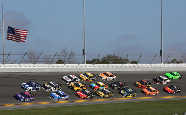 Darrell Wallace Jr., the driver of the #43 Click n’ Close Chevrolet, leads a pack of cars during the Monster Energy NASCAR Cup Series 60th Annual Daytona 500 at Daytona International Speedway on February 18, 2018, in Daytona Beach, Florida. Photo – Jerry Markland/Getty Images