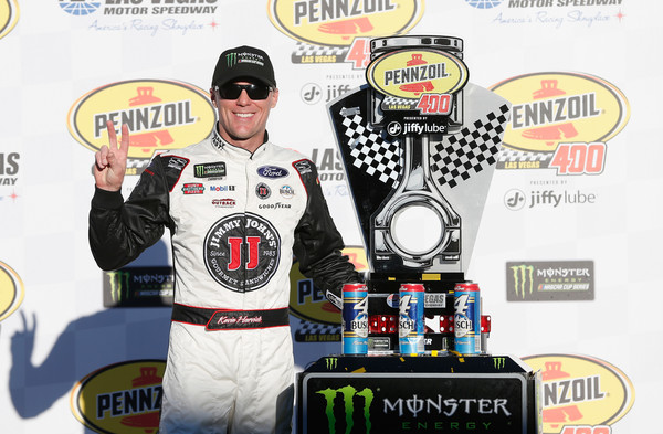Kevin Harvick, the driver of the #4 Jimmy John’s Ford, poses with the trophy during the Monster Energy NASCAR Cup Series Pennzoil 400 presented by Jiffy Lube at Las Vegas Motor Speedway on March 4, 2018, in Las Vegas, Nevada. Photo – Brian Lawdermilk/Getty Images