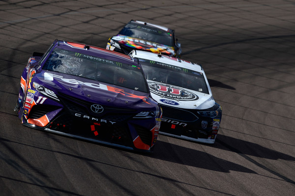 Denny Hamlin, the driver of the #11 FedEx Freight Toyota, leads a pack of cars during the Monster Energy NASCAR Cup Series TicketGuardian 500 at ISM Raceway on March 11, 2018, in Avondale, Arizona. Photo – Robert Laberge/Getty Images