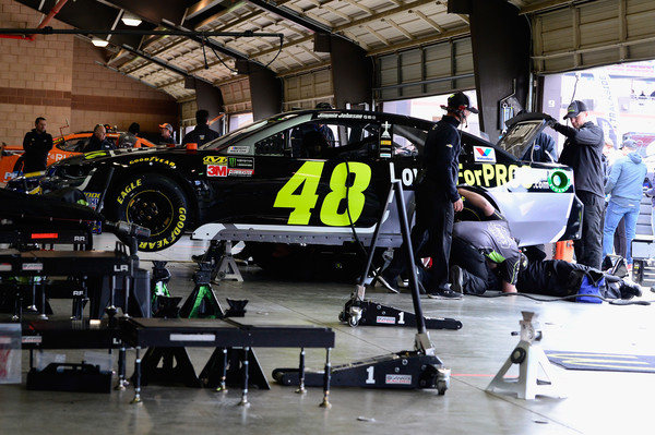 The crew for the #48 Lowe’s For Pros Chevrolet, driven by Jimmie Johnson (not pictured), attempt to work on their car after failing inspection during qualifying for the Monster Energy NASCAR Cup Series Auto Club 400 at Auto Club Speedway on March 16, 2018, in Fontana, California. Photo – Robert Laberge/Getty Images