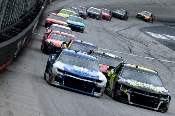 Alex Bowman, the driver of the #88 Nationwide Chevrolet, and Jimmie Johnson, the driver of the #48 Lowe’s for Pros Chevrolet, lead a pack of cars during the rain-delayed Monster Energy NASCAR Cup Series Food City 500 at Bristol Motor Speedway on April 16, 2018, in Bristol, Tennessee. Photo – Sean Gardner/Getty Images