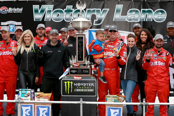 Kyle Busch, the driver of the #18 Skittles Toyota, poses with the trophy after winning the rain-delayed Monster Energy NASCAR Cup Series Food City 500 at Bristol Motor Speedway on April 16, 2018, in Bristol, Tennessee. Photo – Sean Gardner/Getty Images
