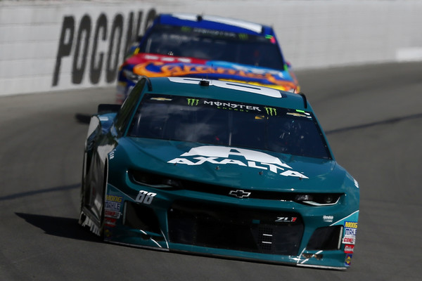 Alex Bowman, the driver of the #88 AXALTA All-Pro Teachers Chevrolet, leads Kyle Busch, driver of the #18 M&M’s Caramel Toyota, during the Monster Energy NASCAR Cup Series Gander Outdoors 400 at Pocono Raceway on July 29, 2018, in Long Pond, Pennsylvania. Photo – Sarah Crabill/Getty Images