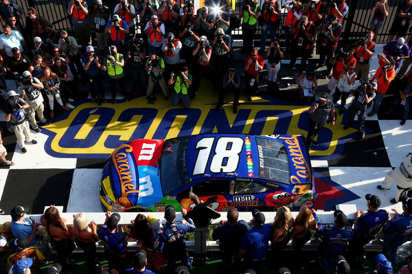 Kyle Busch, the driver of the #18 M&M’s Caramel Toyota, celebrates in Victory Lane after winning the Monster Energy NASCAR Cup Series Gander Outdoors 400 at Pocono Raceway on July 29, 2018, in Long Pond, Pennsylvania. Photo – Sarah Crabill/Getty Images