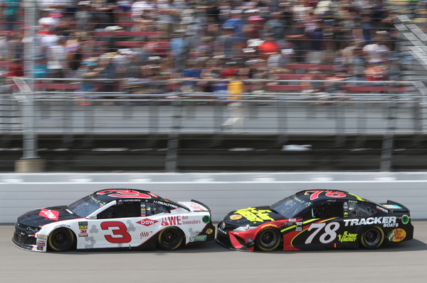 Austin Dillon, the driver of the #3 Dow WE Are Innovators Chevrolet, leads Martin Truex Jr., driver of the #78 5-hour ENERGY/Bass Pro Shops Toyota, during the Monster Energy NASCAR Cup Series Consumers Energy 400 at Michigan International Speedway on August 12, 2018, in Brooklyn, Michigan. Photo – Jerry Markland/Getty Images