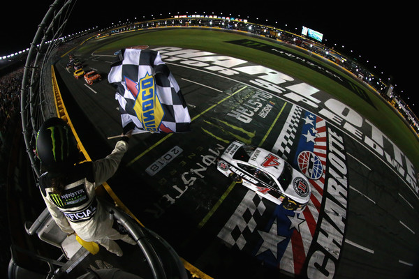 Kevin Harvick, the driver of the #4 Jimmy John’s Ford, takes the checkered flag to win the Monster Energy NASCAR Cup Series All-Star Race at Charlotte Motor Speedway on May 19, 2018, in Charlotte, North Carolina. Photo – Sean Gardner/Getty Images