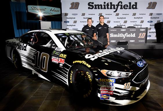 Aric Almirola (R) and Tony Stewart, co-owner of Stewart-Haas Racing, pose for a photo opportunity with the #10 Smithfield Ford during a press conference at Stewart-Haas Racing on November 8, 2017, in Kannapolis, North Carolina. Stewart-Haas Racing introduced Almirola as their driver of the #10 Smithfield Ford for the 2018 season. Photo – Jared C Tilton/Getty Images