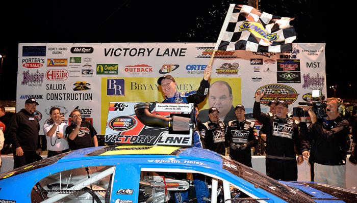 The 16-year-old from Winamac, Indiana, Justin Haley cleared the dominant car of Kyle Benjamin with seven laps to go and sailed to his first career NASCAR K&N Pro Series East victory.