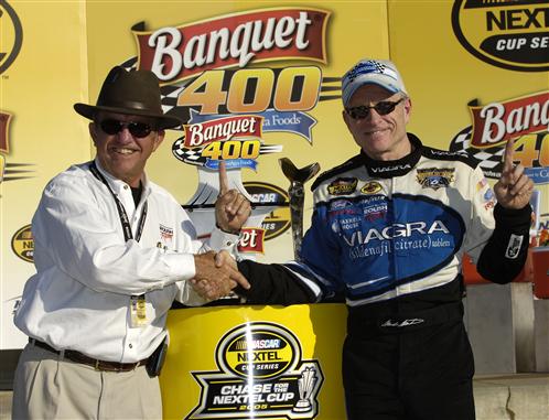 Team owner Jack Roush (L) and Mark Martin, driver of the #6 Viagra Ford, celebrate winning the NASCAR Nextel Cup Series Banquet 400 on October 9, 2005 at the Kansas Speedway in Kansas City, Kansas. Photo – Rusty Jarrett/Getty Images